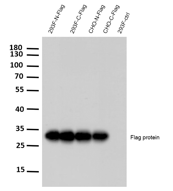 - The antibody detects C-terminal, internal, and N-terminal Flag-tag fusion proteins.